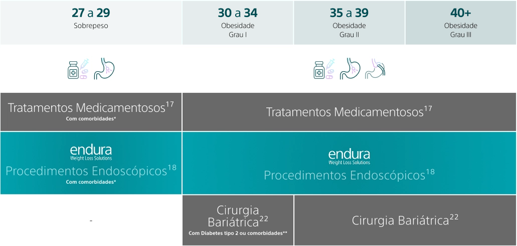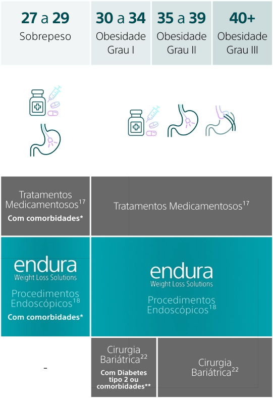 A linha global de soluções Endura Weight Loss Solutions oferece procedimentos minimamente invasivos*, realizados por via endoscópica, que atuam em parceria com você e seu corpo para romper o ciclo recorrente de perda e reganho de peso, traduzindo o resultado do seu esforço em uma perda de peso efetiva e sustentável.